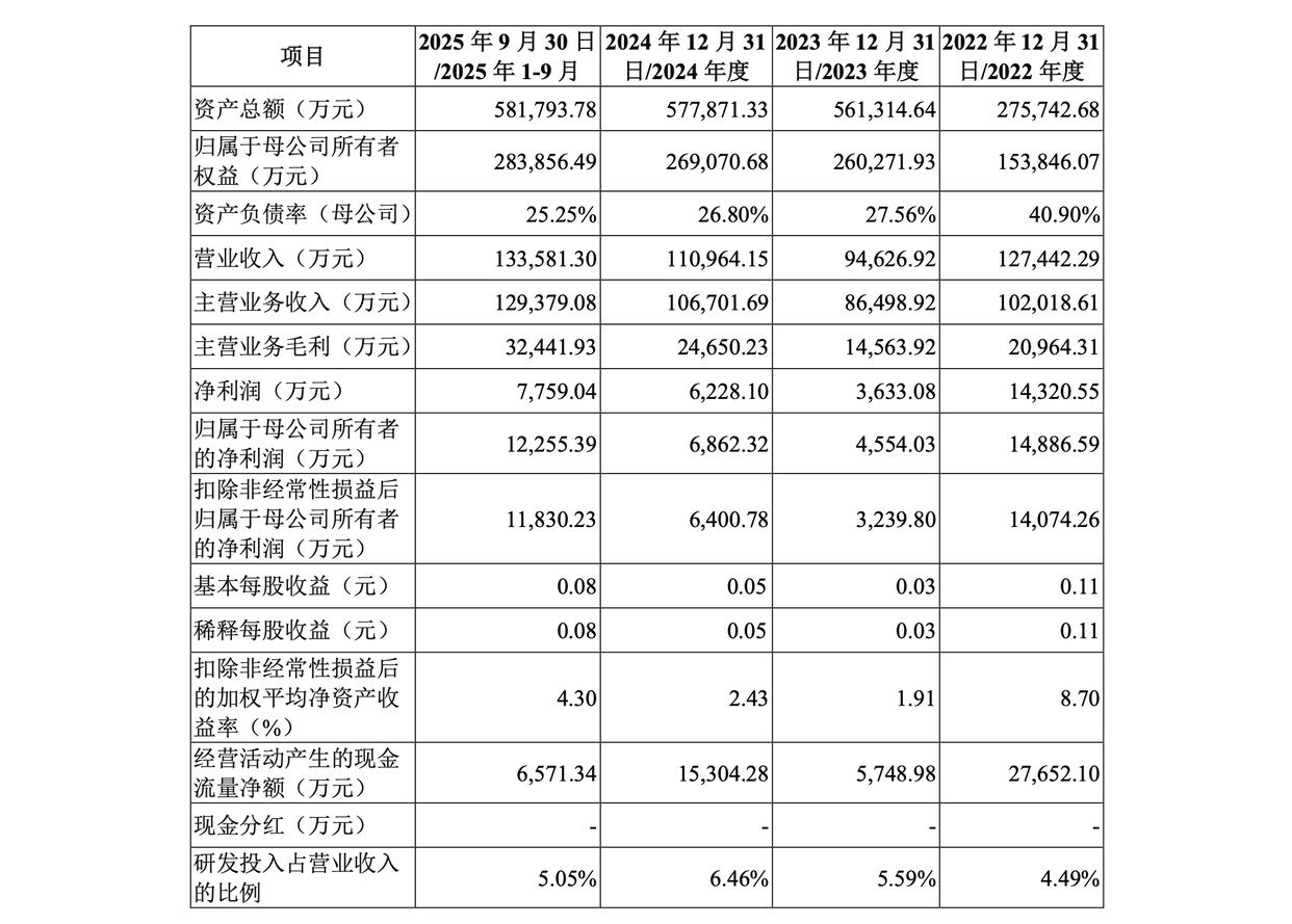2022-2024年及2025年前三季度,鑫华科技的营收分别约12.74亿、9.46亿、11.10亿、13.36亿元;主营业务毛利分别约2.10亿、1.46亿、2.47亿、3.24亿元;综合毛利率分别为23.81%、15.63%、22.44%、24.56%;净利润分别约1.43亿、3633.08万、6228.10万、7759.04万元;扣非归母净利润分别约1.41亿、3239.80万、6400.78万、1.18亿元。
