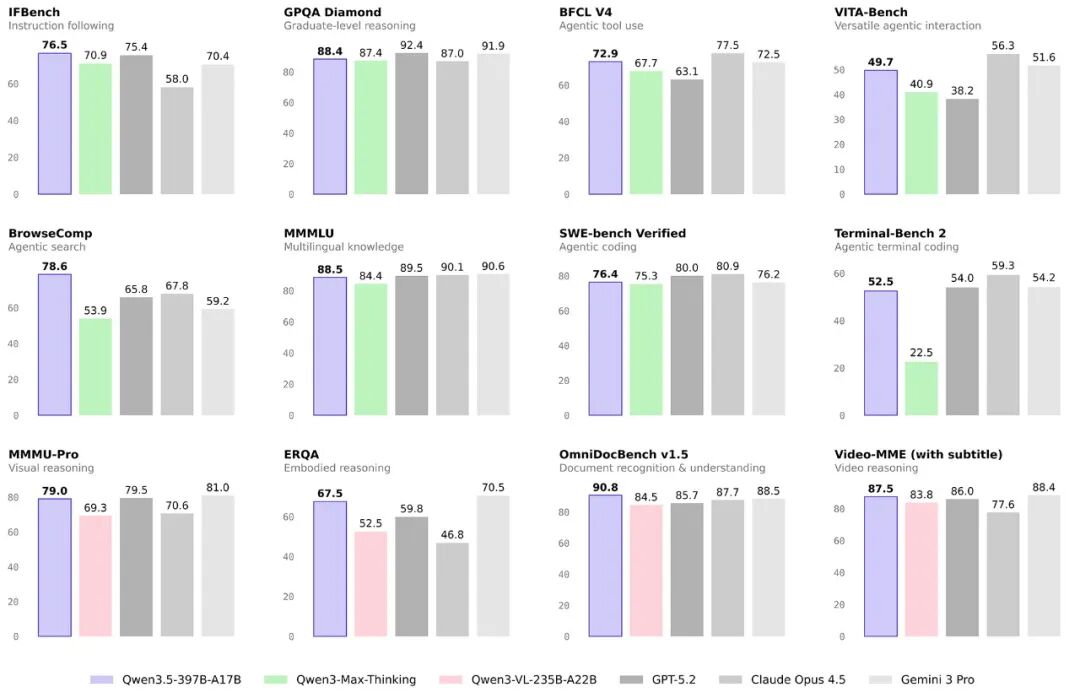 千问3.5在文本和视觉的混合数据上预训练,实现了原生多模态的新突破,在推理、编程、Agent智能体等全方位基准评估中均表现优异,并在视觉理解能力的权威评测中斩获数项性能最佳。