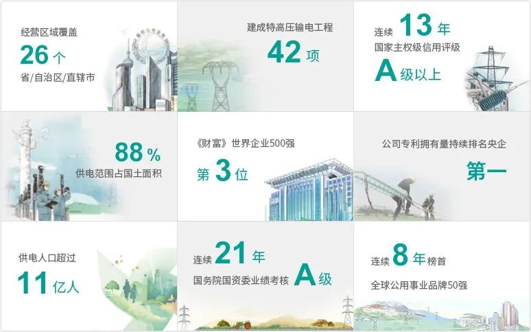 公司经营区域覆盖我国26个省(自治区、直辖市),供电范围占国土面积的88%,供电人口超过11亿。近20多年来,国家电网持续保持全球特大型电网最长安全纪录,建成42项特高压输电工程,成为世界上输电能力最强、新能源并网规模最大的电网,公司专利拥有量持续排名央企第一。公司位列2025年《财富》世界500强第3位,连续21年获国务院国资委业绩考核A级,连续13年获标准普尔、穆迪、惠誉三大国际评级机构国家主权级信用评级(标普A+、穆迪A1、惠誉A+),连续8年位居全球公用事业品牌50强榜首,是全球最大的公用事业企业,也是具有行业引领力和国际影响力的创新型企业。