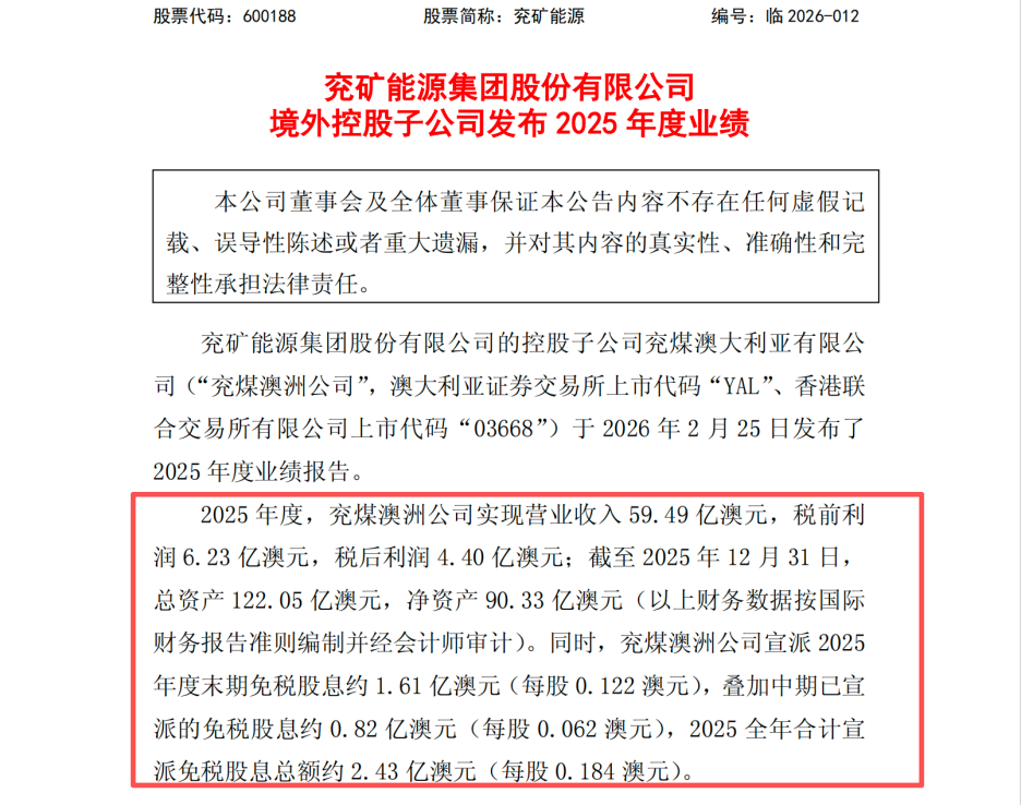 兖矿能源集团股份有限公司的境外控股子公司——兖煤澳大利亚有限公司正式披露了其2025年度业绩:全年实现营业收入59.49亿澳元,税前利润6.23亿澳元,税后利润4.40亿澳元;公司宣派2025年度末期免税股息约1.61亿澳元,叠加中期股息,全年合计宣派免税股息总额约2.43亿澳元。截至2025年12月31日,这家跨国煤矿巨头的总资产达到122.05亿澳元,净资产为90.33亿澳元,且四季度结束时拥有超过20亿澳元现金,维持了无计息债务的极度健康状态。