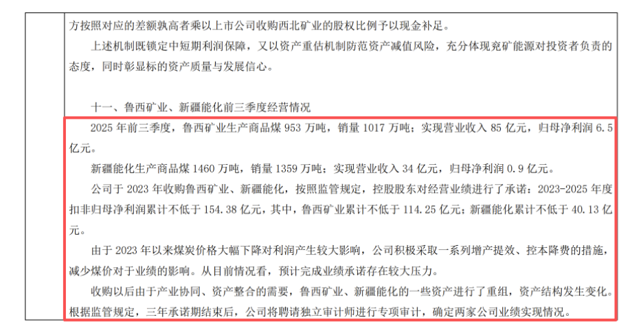 叠加在债务之上的是历史并购带来的业绩承诺兑现压力。2023年,公司在收购鲁西矿业与新疆能化时,控股股东曾立下军令状:承诺两家公司2023-2025年度扣非归母净利润累计分别不低于114.25亿元和40.13亿元(合计154.38亿元)。然而,残酷的煤价下行击穿了当初的乐观测算。2025年前三季度,鲁西矿业实现归母净利润6.5亿元,新疆能化仅为区区0.9亿元。