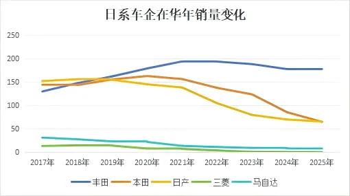 日系主要品牌在华年销量变化(2017年至2025年)。