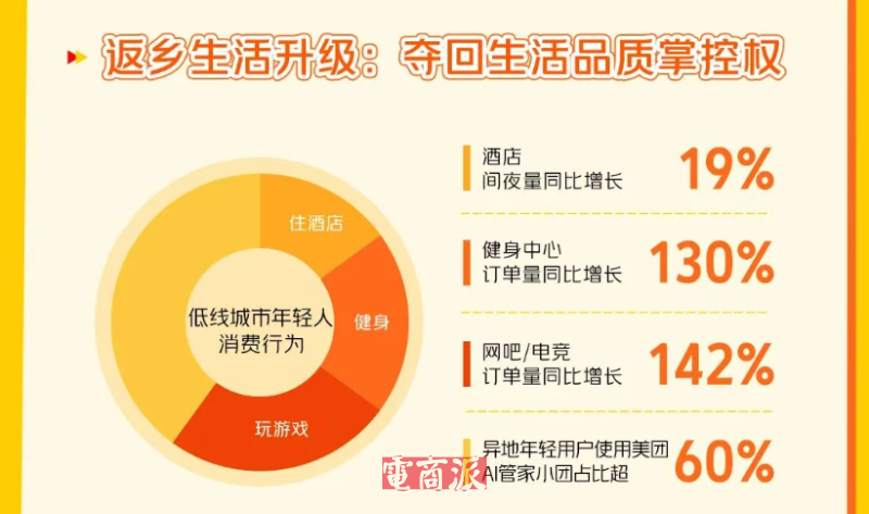 返乡过年的年轻人,不仅带回了年货,也将大城市的生活方式带到了县城。“回家不住家里住酒店”成了县城过年新风尚。美团数据显示,低线城市酒店订单量同比增长19%,健身中心订单量暴涨130%。美容美发、按摩足疗等店铺也因为返乡年轻人的到来,迎来了一年中最忙碌的时刻。这种生活方式的衔接也体现在餐桌上。春节假期,“必吃榜”整体流量较去年春节同期增长近30%,商家订单增幅接近80%,不少返乡青年选择带家人换换口味。