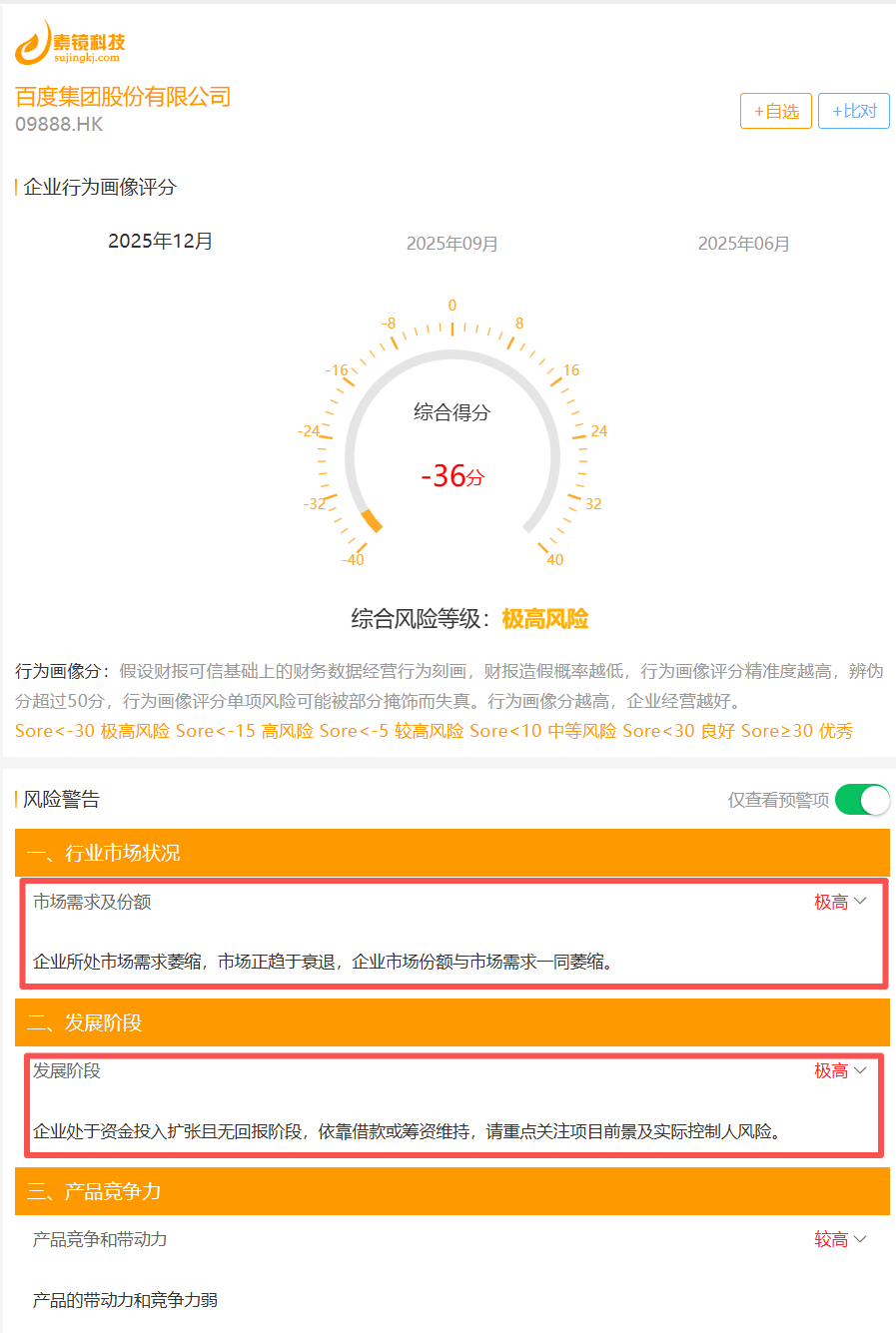 2025年报总体经营状况(行为画像)较三季报略好,但仍在违约预警线下方(民企-30分)。从2025年经营画像报告看:最大风险是隐藏负债和还款压力下的资金链紧绷;其次,自身收入和市场份额下滑严重+业务转型所致大规模投资,造血能力放缓叠加快速失血,资金链危机显现。后续如果持续未能获得新的融资资金进入,爆雷几乎是必然,在这样的状况下,催生昆仑芯IPO似乎也是必然。