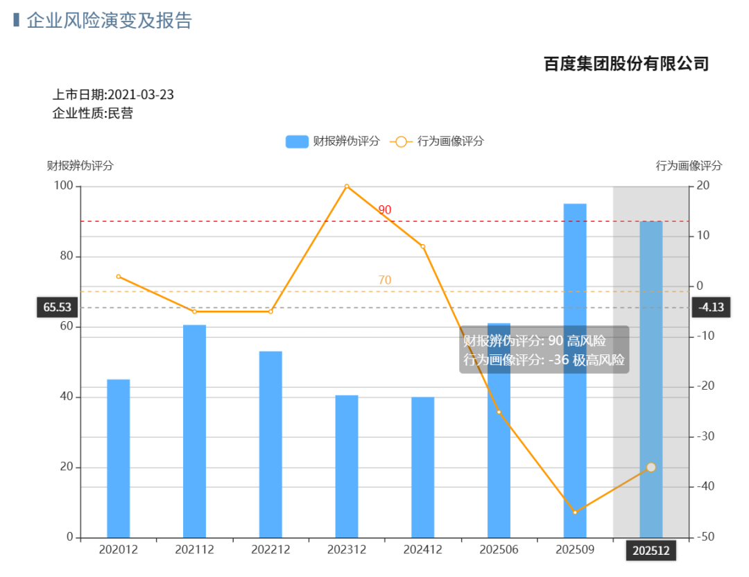 正好百度公布年报,从下图从素镜模型可见,辨伪信号虽然略降,但依然高风险。