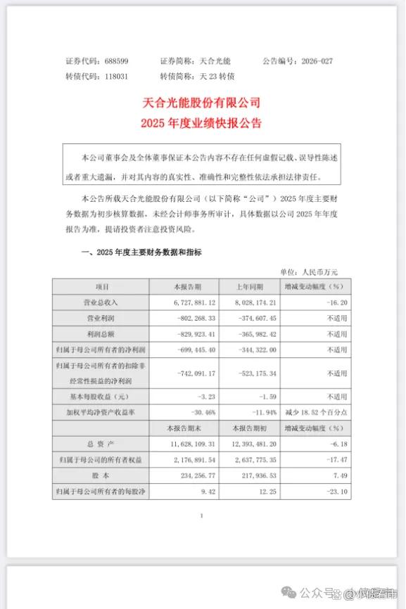 2月26日,天合光能(688599.SH)披露2025年度业绩快报,2025年归属于母公司所有者的净利润亏损69.94亿元,较上年同期亏损34.43亿元进一步扩大。