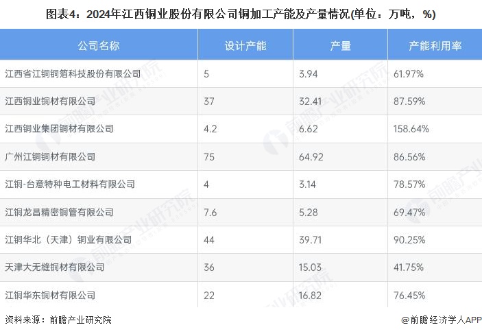 2024年,江西铜业铜加工设计产能达到了234.8万吨,产量为187.87万吨。