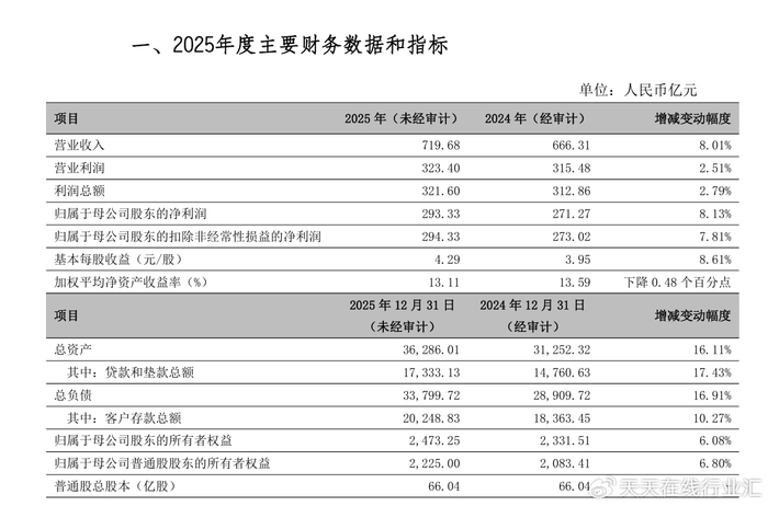 未经审计的数据显示,2025年宁波银行实现营业收入719.68亿元,同比增长8.01%;实现归母净利润293.33亿元,同比增长8.13%。