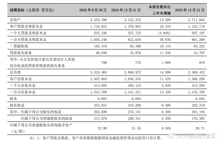 据年度业绩快报,截至2025年末宁波银行总资产达3.63万亿元,较年初增长16.11%,贷款和垫款总额1.73万亿元,较年初增长17.43%。