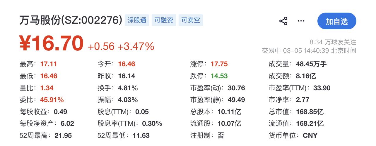 截至发稿,万马股份涨3.47%,报16.7元,总市值168.85亿元。