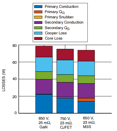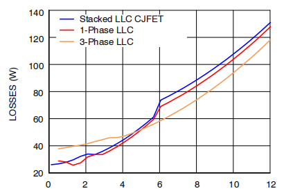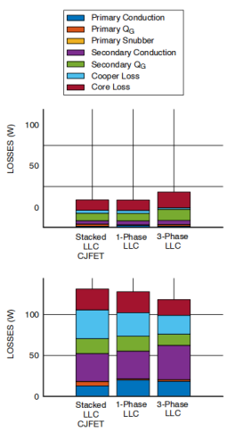 图2.采用不同原边开关器件的堆叠式LLC转换器系统损耗