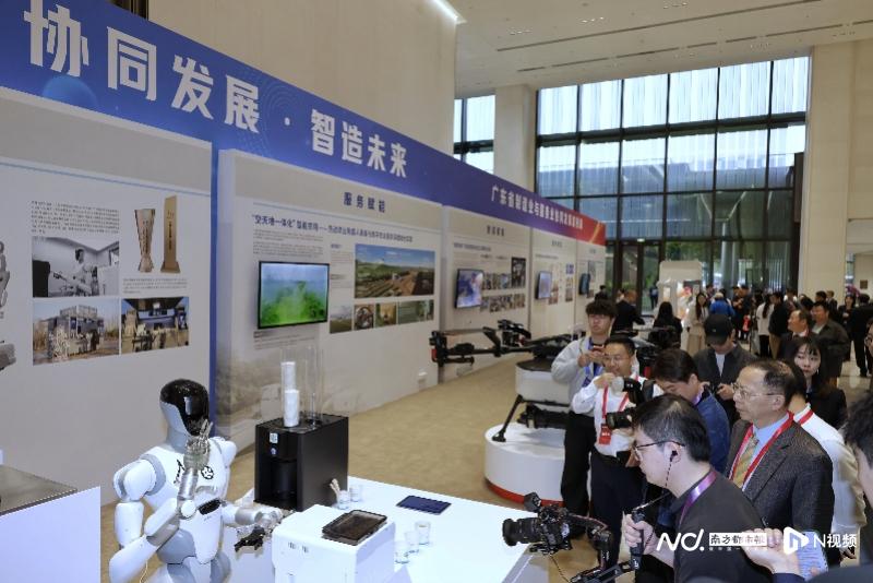 2026年广东省高质量发展大会上,参会者在咖啡机器人、农业无人机等展位前驻足观看。