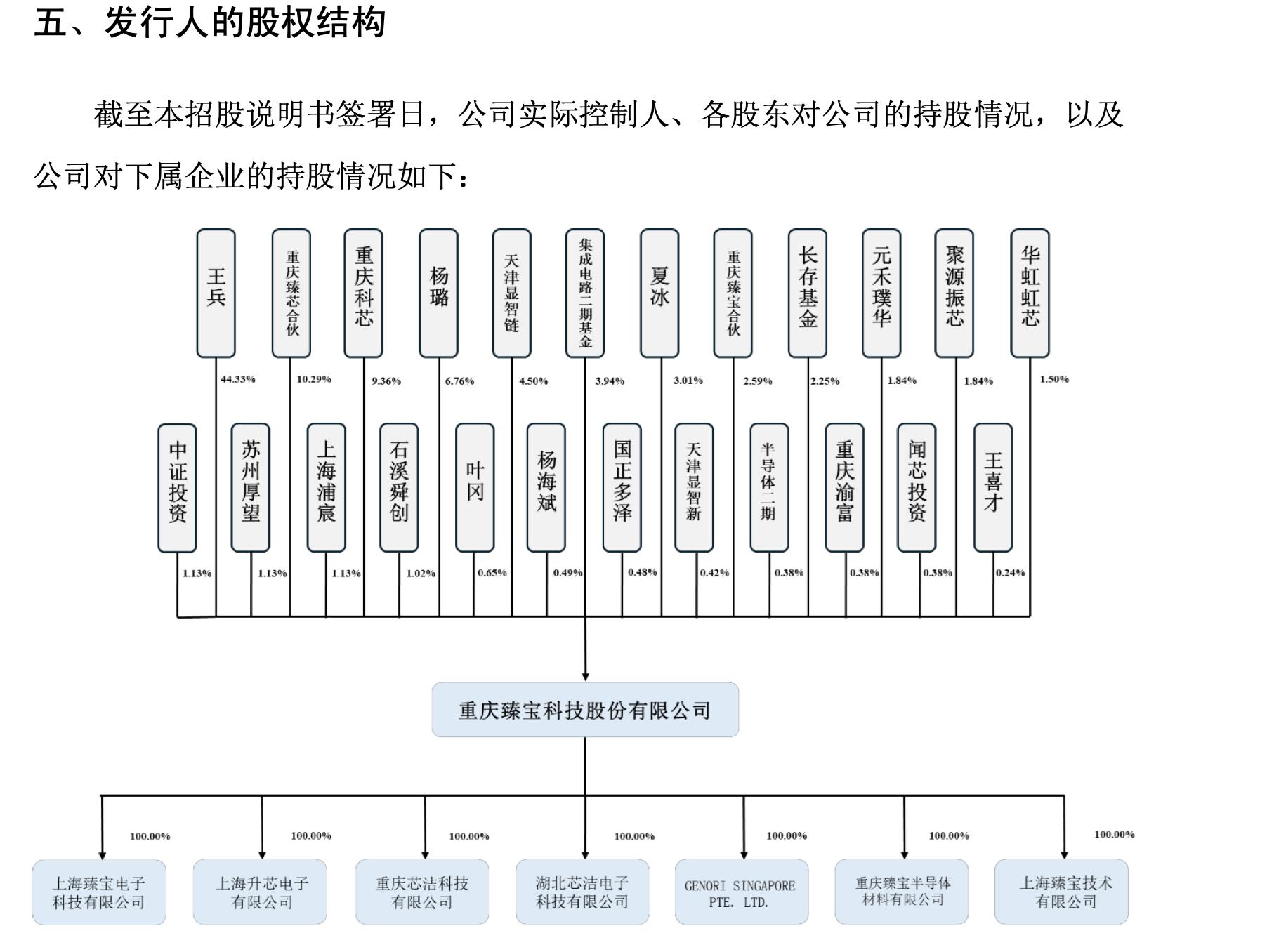 其他股东方面,股权穿透显示,重庆物流产业投资、国家集成电路产业投资基金二期、湖北集成电路产业投资基金、华虹虹芯基金、上海国盛投资集团、合肥产投集团、浦科投资、渝富资本、厚熙投资等一众国有资本均入股,分别持有臻宝科技9.36%、3.94%、2.25%、1.5%、1.13%、0.48%、0.38%、0.38%、0.38%的股份,且上述国有资本中不乏多家集成电路领域的投资机构。