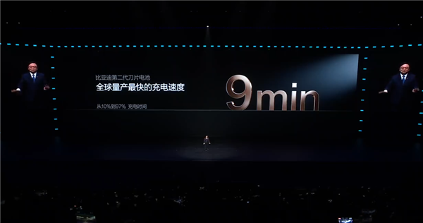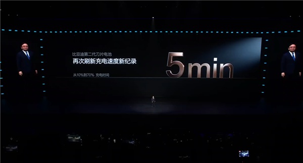 王传福表示,比亚迪第二代刀片电池从10%充至70%,只需5分钟,和加油速度一样快;从10%充至97%,只需9分钟,创下全球量产最快的充电速度。
