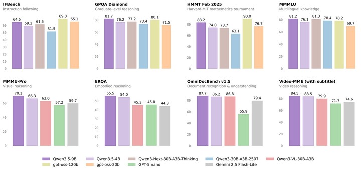Qwen 3.5 Small 系列中,9B 参数的模型在多项基准测试中全面超越了 OpenAI 的 gpt-oss-120B——一个参数量是它 13 倍的模型。