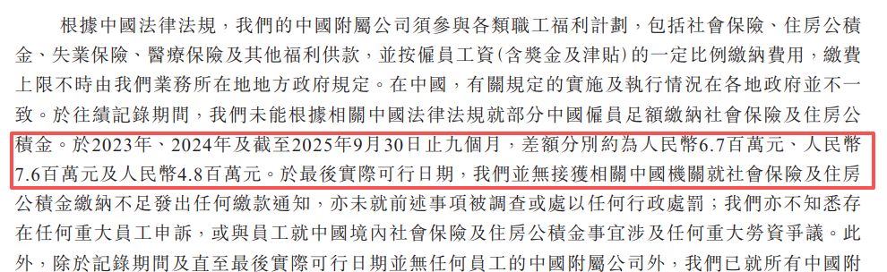 在中国境内,公司同样未能为部分雇员足额缴纳社会保险及住房公积金。报告期内相关欠缴差额分别约为670万元、760万元和480万元人民币,累计拖欠超1910万元人民币。招股书风险因素章节提示,相关中国地方政府部门有权要求公司在指定期限内补足差额,并且可以对公司加收每日万分之五的滞纳金,或处以欠缴金额一至三倍的行政罚款。