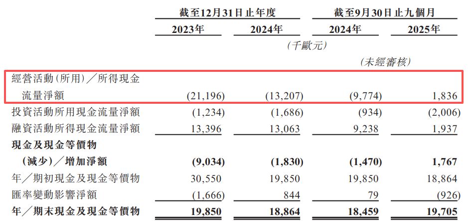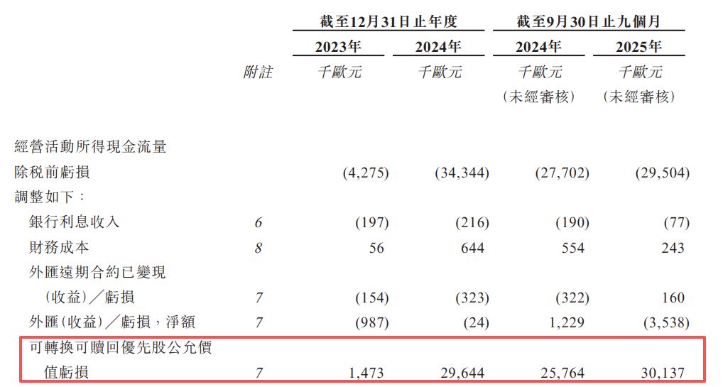 然而,招股书显示,2023年、2024年和2025年前三季度(下称“报告期内”),公司负债净额持续扩大。截至各报告期末,公司负债净额分别为943.1万欧元、4386.1万欧元和6735.1万欧元。造成账面负债和亏损的核心原因之一为优先股公允价值亏损。上述各期,公司因此产生的非现金亏损分别为147.3万欧元、2964.4万欧元和3013.7万欧元,进而导致各期分别录得净亏损465.3万欧元、3446.7万欧元和3000.3万欧元。