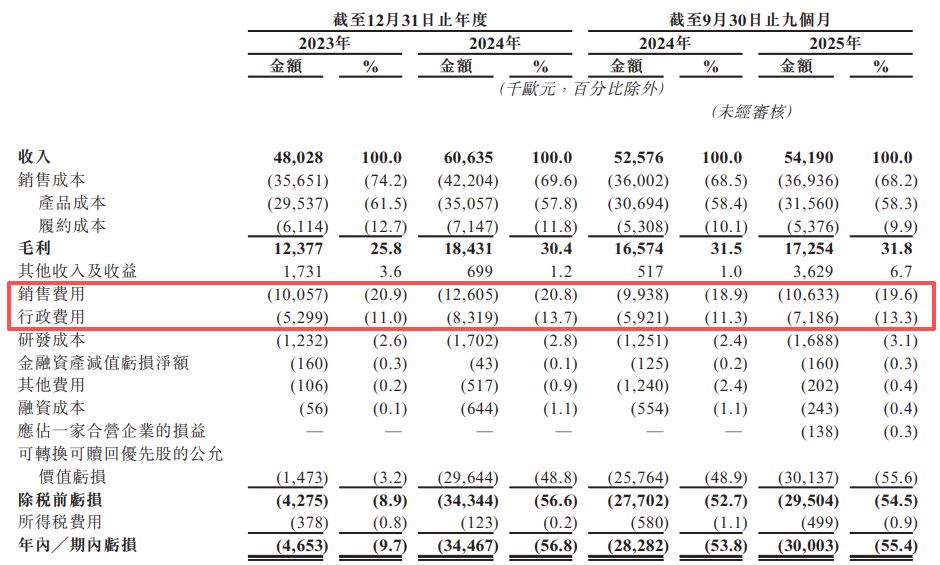 现金流方面,2023年和2024年,公司经营活动现金流净额分别为-2119.6万欧元和-1320.7万欧元,直到2025年前三季度才转正为183.6万欧元。此外,公司销售与行政开支高企。报告期内,其销售费用分别达1005.7万欧元、1260.5万欧元和1063.3万欧元,占同期总收入比重约20%;行政费用分别达529.9万欧元、831.9万欧元和718.6万欧元。扣除各项开支后,公司在2025年前三季度经调整净利润率(非国际财务报告准则计量)为2.3%。
