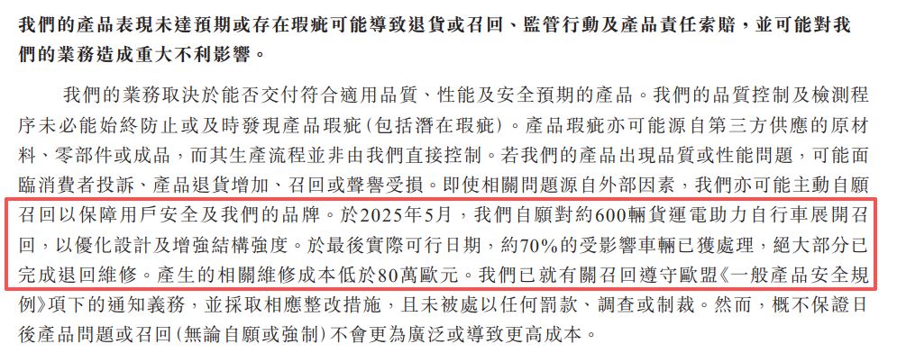 每经记者还注意到,在依赖外部代工的模式下,TENWAYS的品控面临挑战。2025年5月,公司针对2024年新推出的货运电助力自行车(Cargo e-bikes)发起一次自愿召回,受影响车辆约600辆。招股书称,召回原因为该产品需要“优化设计及增强结构强度”。截至递表,约70%的受影响车辆已完成退回维修处理,产生相关维修成本近80万欧元。此外,财务数据显示,公司在报告期内分别确认了110万欧元、120万欧元和110万欧元的产品保修拨备。在以OEM合作伙伴为主的生产架构下,供应商的制造质量直接关系到公司的财务表现及售后成本。