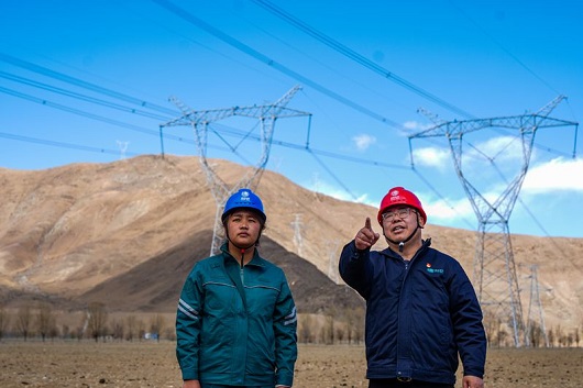 裘愉涛(右一)在西藏特高压输电线路踏勘了解电源点和通道情况。