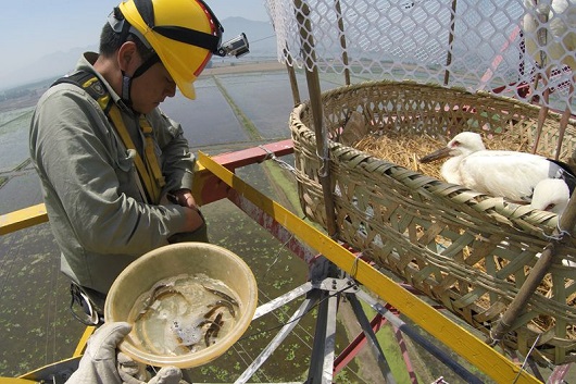 国家电网黄石供电公司爱鸟护鸟志愿服务队队员在电力铁塔上新安装的鸟巢旁喂养东方白鹳。