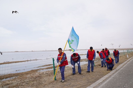 国网青海海北刚察县供电公司环保志愿服务队在青海湖捡拾垃圾。