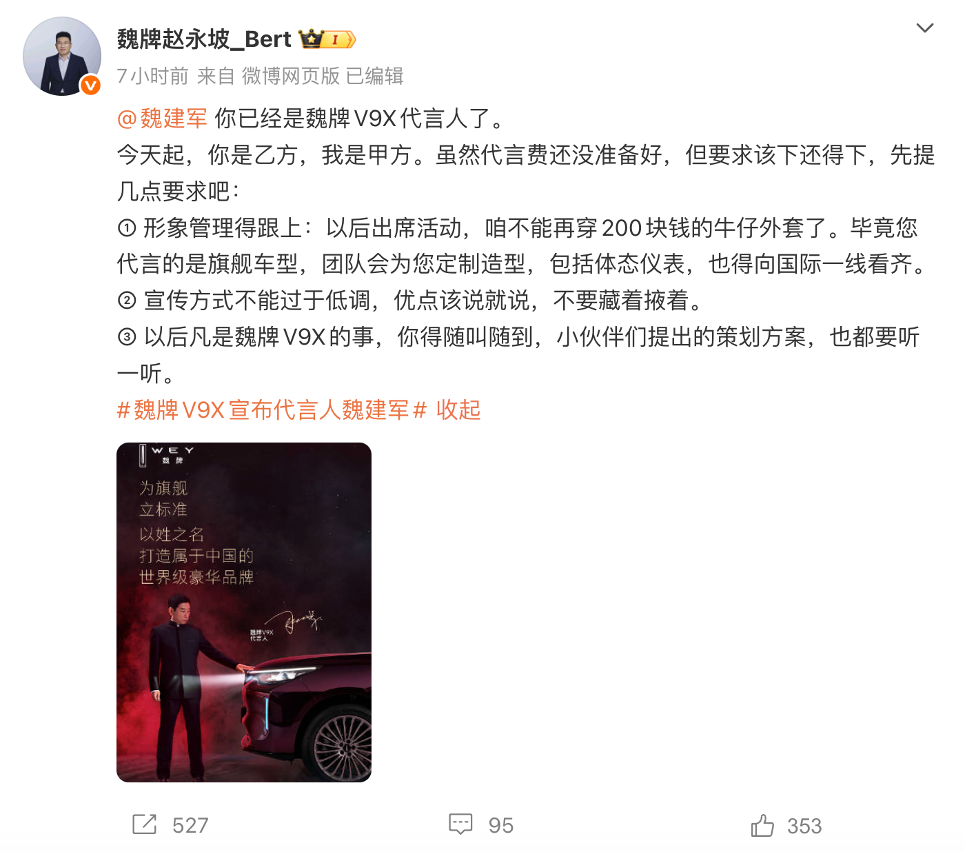 3月5日,魏牌CEO赵永坡宣布,魏建军成为魏牌V9X的代言人,并以“甲方”身份对这位新代言人提出了明确要求。