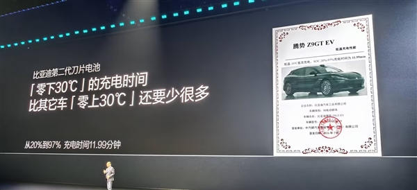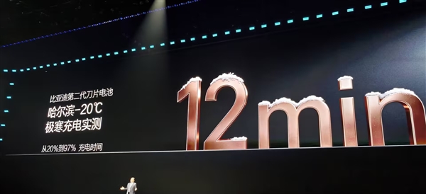 此外,发布会还公布了-30℃极端环境测试数据:搭载第二代刀片电池的车型从20%充至97%仅需12分钟,与常温9分钟充电时长相比多3分钟,实现“零下30℃只多3分钟”的技术突破。