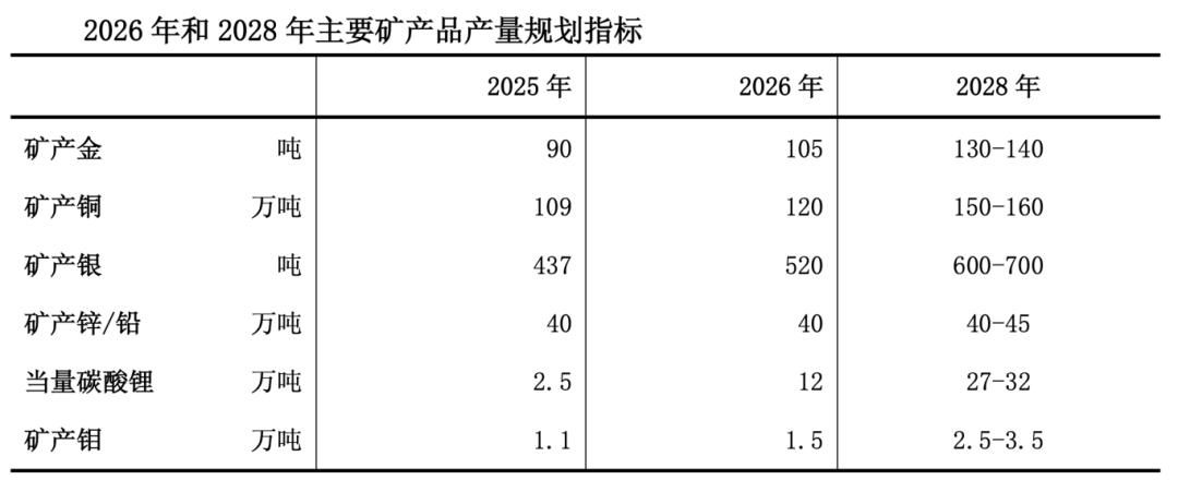 根据紫金矿业发布的2026-2028年三年规划,在2028年黄金产量将达130-140吨,较2025年增幅超30%;铜产量将达150-160万吨,较2025年增幅超35%,剑指全球铜、金产量前三;银产量将达到600—700吨,较2025年增幅超35%;碳酸锂产量将达27-32万吨,较2025年增幅近十倍。