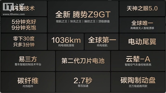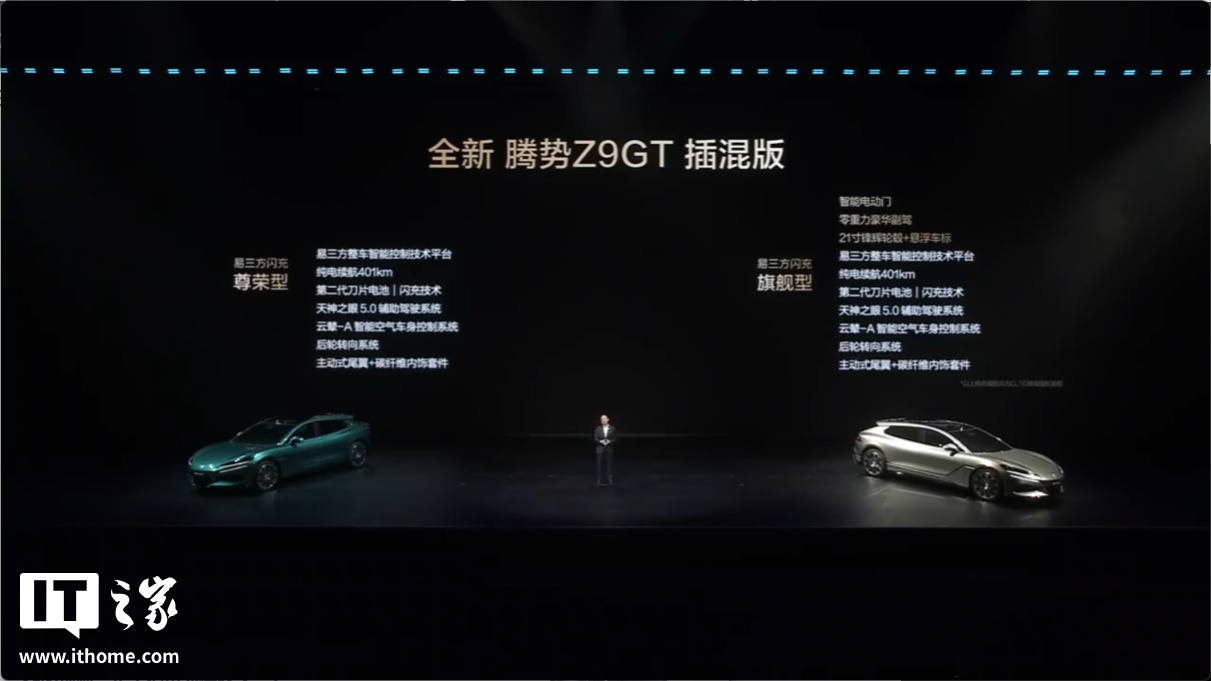 IT之家 3 月 5 日消息,在今晚的比亚迪二代刀片电池暨闪充技术发布会上,比亚迪发布了全新腾势 Z9GT,售价 26.98 万元起。新车搭载第二代刀片电池,提供纯电版和插混版,纯电版 CLTC 纯电续航里程 1036 公里,全球第一,插混版纯电续航 401 公里,综合续航 1301 公里。