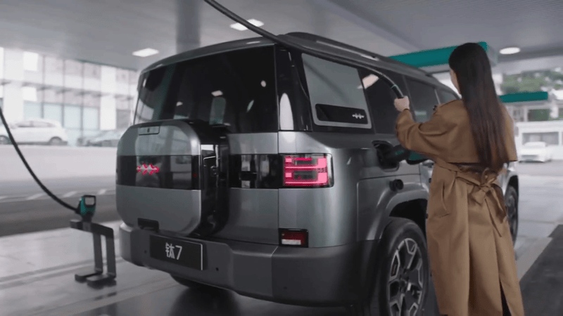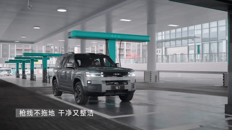车身侧面,可以看到新车采用全新样式的轮圈造型,拥有外扩的轮眉,并配备常规造型的车门把手,方盒子造型硬朗挺拔。钛7EV闪充版或搭载超大电动前备箱,空间实用性更强。