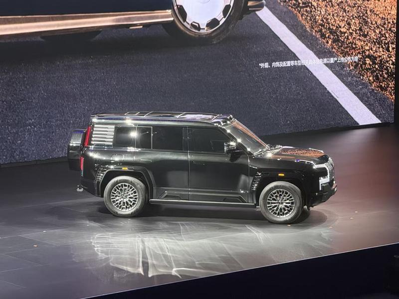 车身侧面,新车整体遵循“鼎立天地”的设计哲学,以方正线条勾勒出威严气场,大气磅礴、纵览四方。细节之处熏黑处理的前保险杠、极简式轮眉、车身同色的侧裙以及隐藏式尾灯,让车身设计更加简洁统一,高端行政气息自然流露。