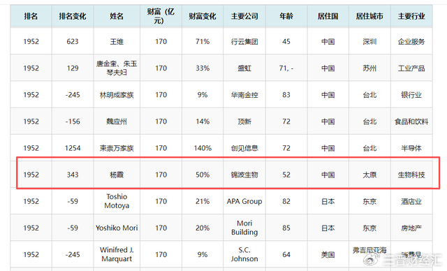 锦波生物创始人杨霞,以170亿元财富再次问鼎“山西女首富”,其财富较去年大幅增长50%,全球排名跃升343位至第1952位。