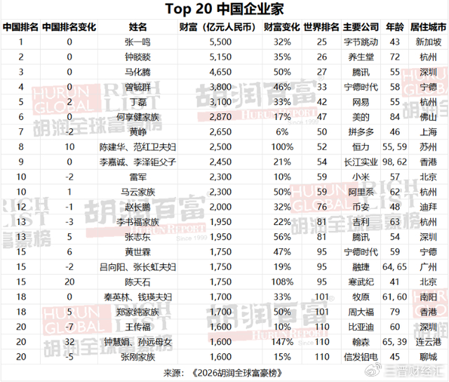 2026胡润全球富豪榜出炉,山西这些企业家上榜,女首富财富猛增50%