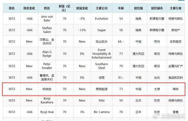 美锦能源姚俊良则以70亿元财富重新进入该榜单,总排名3872名。
