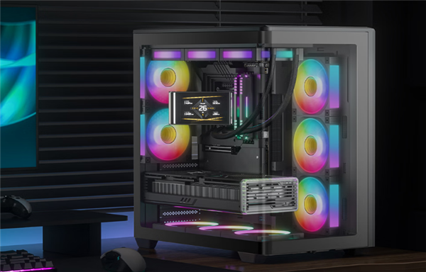 屏幕支持90°可旋转角度,采用阻尼转轴设计,让屏幕可以稳定地停留在任意角度,配合海景房机箱使用视觉效果相当亮眼。用户还可以将其作为副屏使用,支持最多11张图片和5个视频的播放,为个性化展示和创意玩法提供了更多可能。