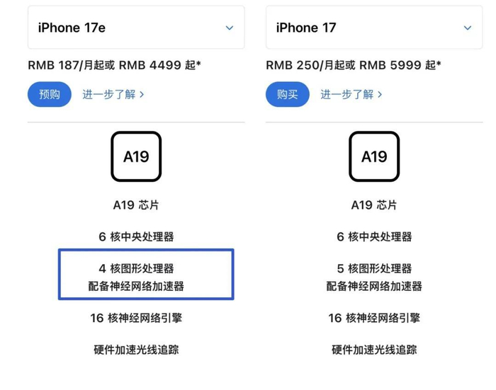 当然需要注意的是,iPhone 17e 搭载的是阉割版的 A19 芯片,只有4 核 GPU,相比 iPhone 17 标准版上的 A19 少了一颗 GPU 核心。