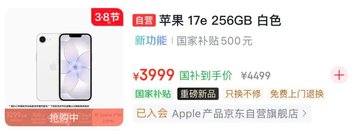并且在部分平台还能叠加国补,比如在京东平台,现在的 iPhone 17e 国补后到手价为3999 元起。