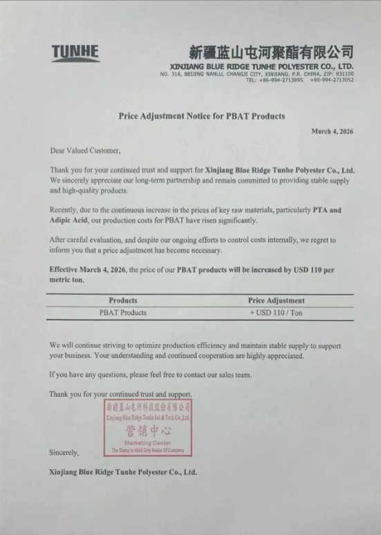 2026年3月初,塑化行业迎来一则反常的消息:金发科技、蓝山屯河两大头部企业接连发布PBAT产品涨价函,其中金发科技PBAT树脂类产品上调700元/吨,蓝山屯河PBAT产品涨幅折合人民币约759元/吨。