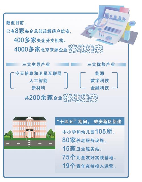 “十四五”期间,雄安新区新建中小学和幼儿园105所,北京四中、人大附中等牵头集团化办学,雄安宣武医院运营良好,80家养老服务设施、15家卫生服务站、75个儿童友好实践基地、19个青年夜校投入运营。