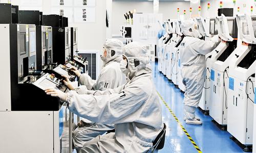 3月2日,河北圣昊光电科技有限公司芯片测试车间,员工在生产线上作业。本报记者史晟全摄