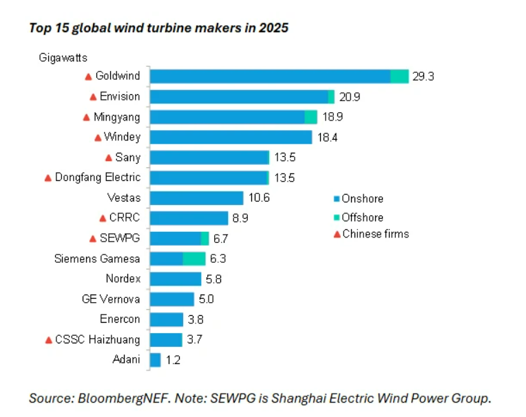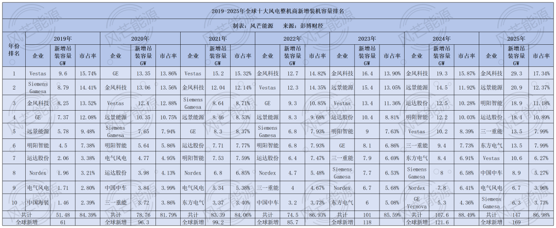 彭博公布2025年全球风电吊装排名:金风、远景、明阳TOP3,中国整机商包揽前六!