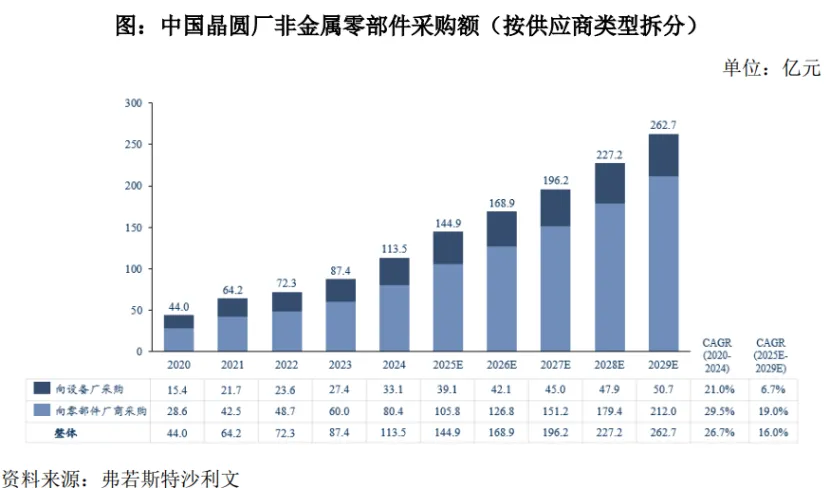 据弗若斯特沙利文数据,2024年在国内晶圆厂的非金属零部件整体113.5亿元的采购额中,向零部件厂商直接采购的占比达到70.8%。
