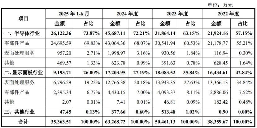 2022年至2025年上半年(简称“报告期”),公司来自半导体行业的营收占比从57.15%提升至73.87%,其中大半由零部件产品贡献;显示面板行业的营收占比从42.84%降至26%。