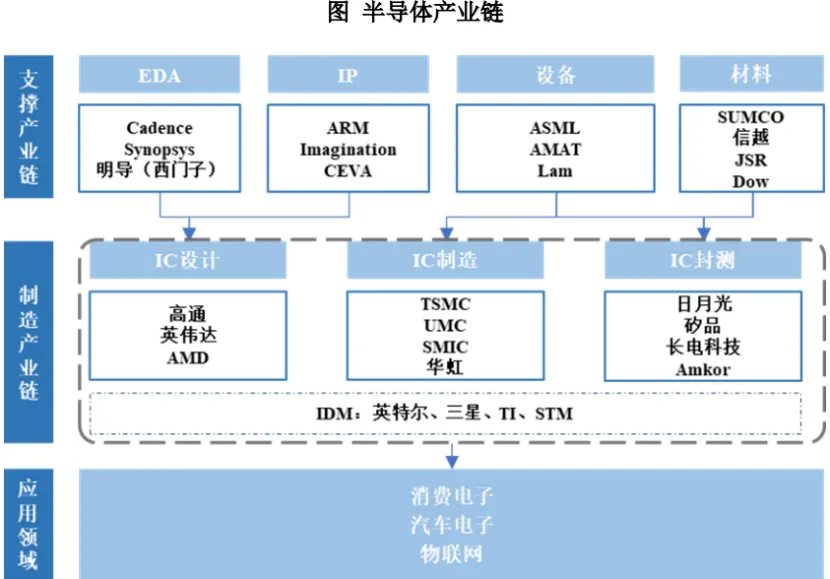 从产业链结构来看,半导体产业链上游包括半导体材料、半导体设备、EDA软件、IP核等支撑产业,参与者有楷登电子(Cadence)、新思科技(Synopsys)、西门子、ARM、Imagination、CEVA、ASML、应用材料(AMAT)、东京电子、北方华创、中微公司、拓荆科技、华大九天、芯源微、SUMCO、信越化学、JSR、沪硅产业等。