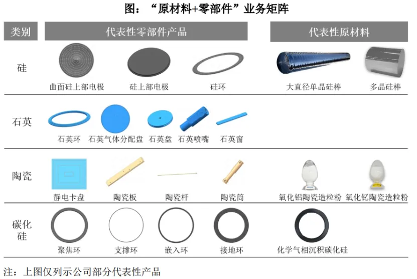 臻宝科技处于半导体产业链中游,主要聚焦于芯片制造环节,主要为晶圆厂供应刻蚀、薄膜沉积设备零部件产品及表面处理服务。公司主要产品为硅、石英、碳化硅和氧化铝陶瓷等设备零部件产品,以及熔射再生、阳极氧化和精密清洗等表面处理服务。