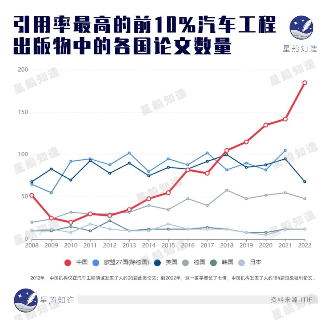 汽车工程出版物在被引用次数前10%的出版物数量。见下图
