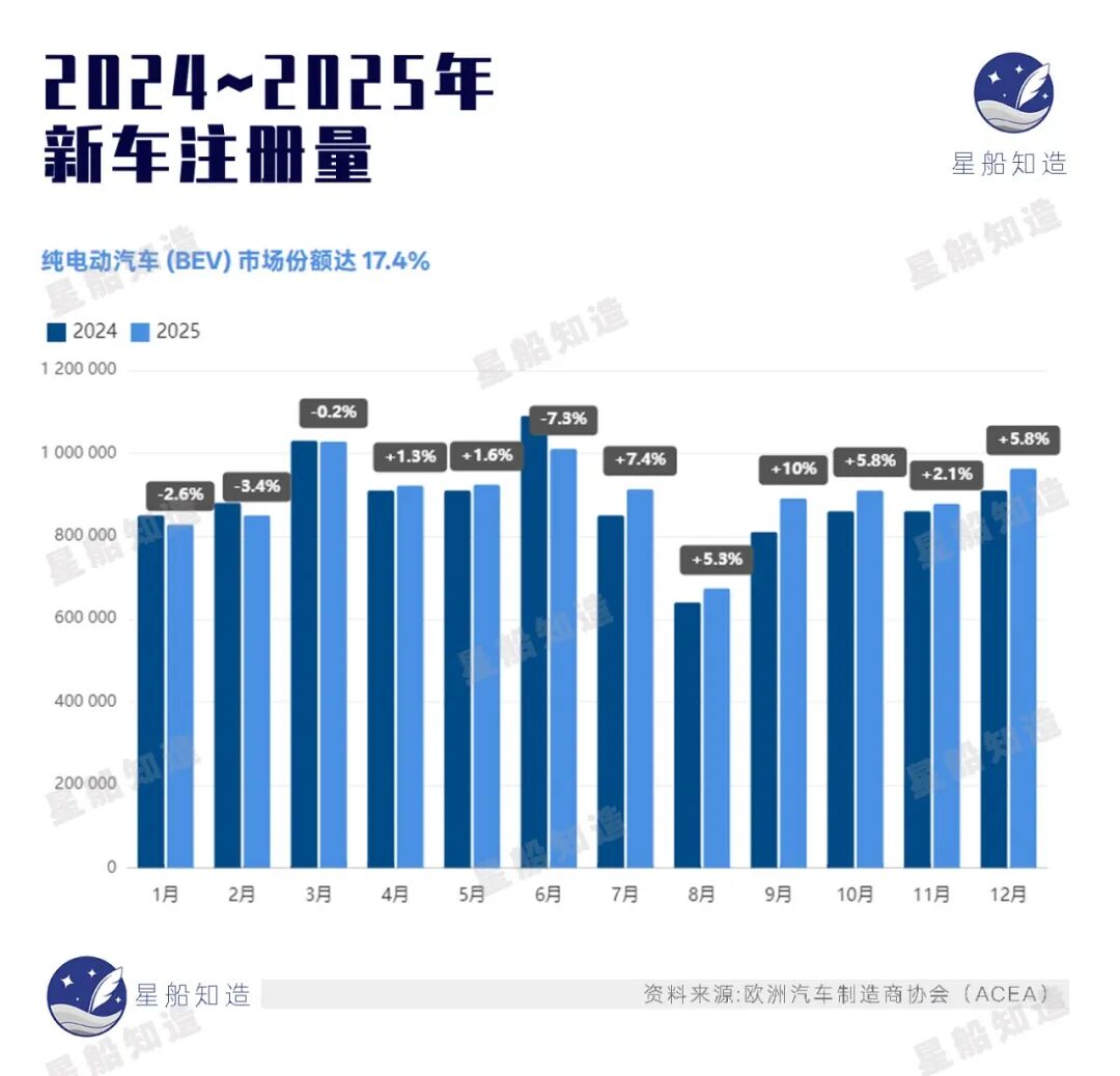 《星船知造》在欧洲汽车制造商协会(ACEA)最新统计看到,尽管有一系列政策强推,但2025年全年欧洲新车注册中,纯电动车(BEV)的市场份额仅维持在17.4%,远未达到欧盟激进路线图所设想的“爆发点”。见下图
