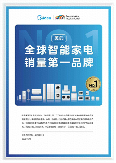 欧睿信息咨询(上海)有限公司发布权威调研结果:美的被正式认证为2025年全球智能家电销量第一品牌。