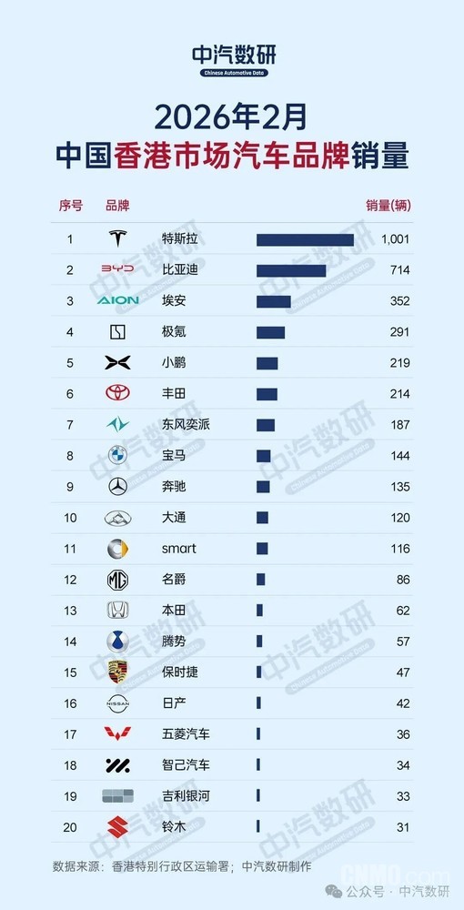 【CNMO科技消息】3月10日,中汽数研公布了2026年2月香港汽车销量数据。